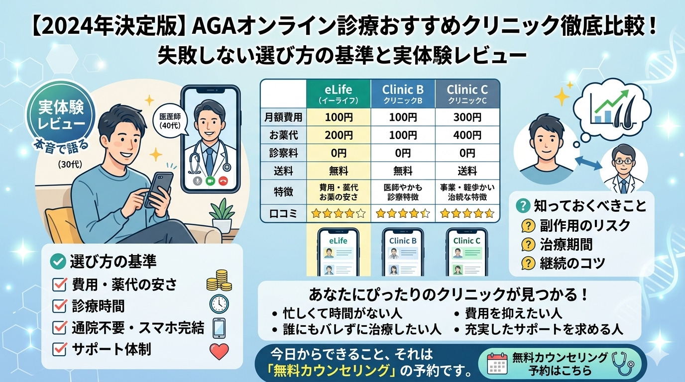 この記事では、AGAオンライン診療で人気のeLifeと、その他の主要クリニックを徹底的に比較します。料金、診察時間、サポート体制、そして私の実体験も踏まえながら、「あなたにとって最適なクリニックはどこなのか?」を、包み隠さずお伝えします。